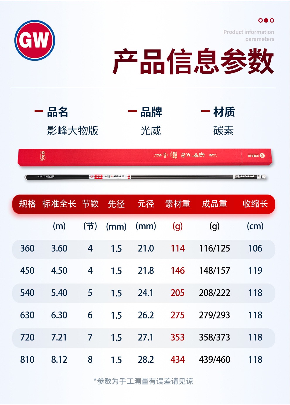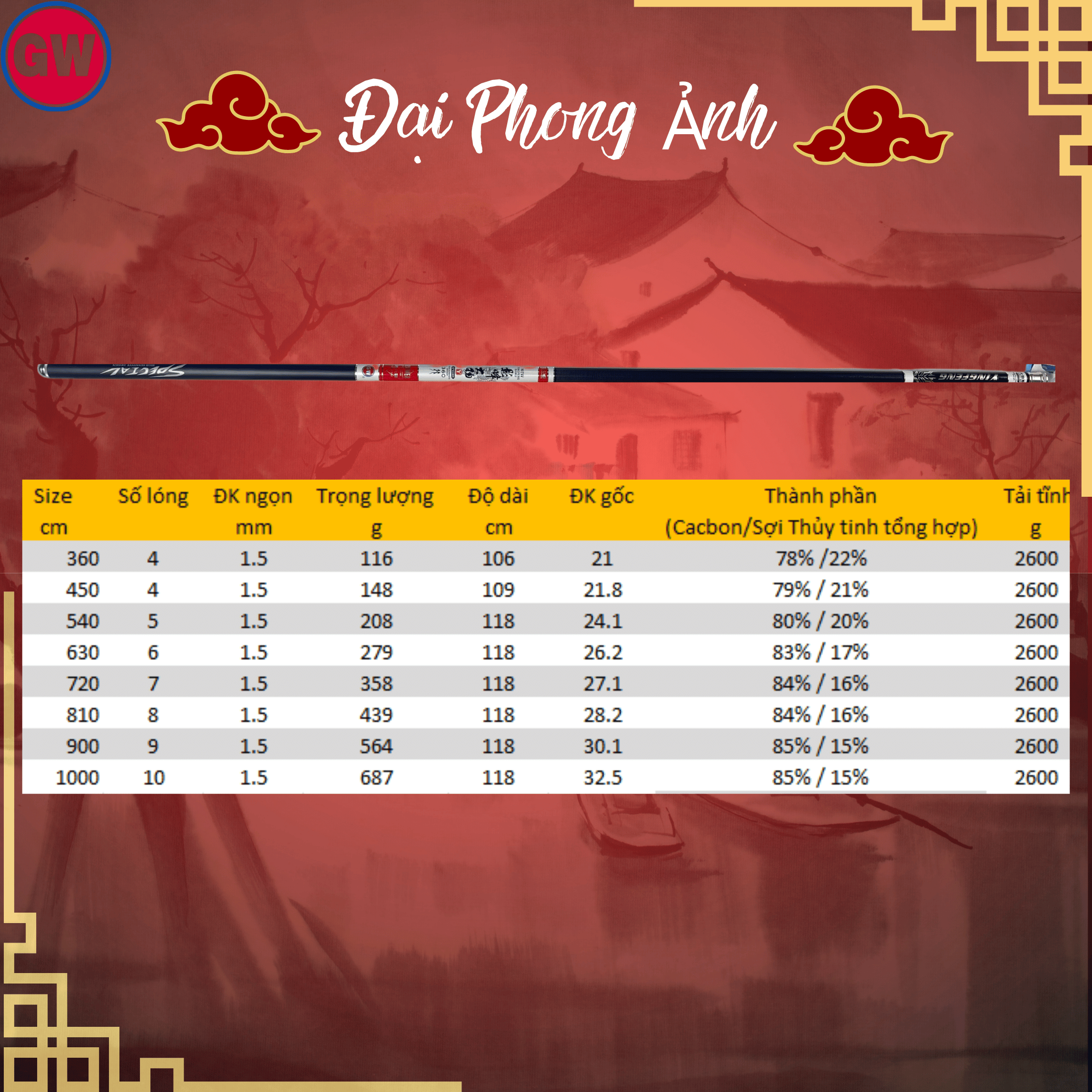 LÀ phiên bản nâng cấp của GW Phong Ảnh, Đại Phong Ảnh có thay đổi về màu sắc, thiết kế thân cần để nâng cao độ dẻo dai, bền bỉ và sức tải cá. Khi quý khách mua 1 cây Đại Phong Ảnh sẽ được tặng thêm lóng 1 và 2.