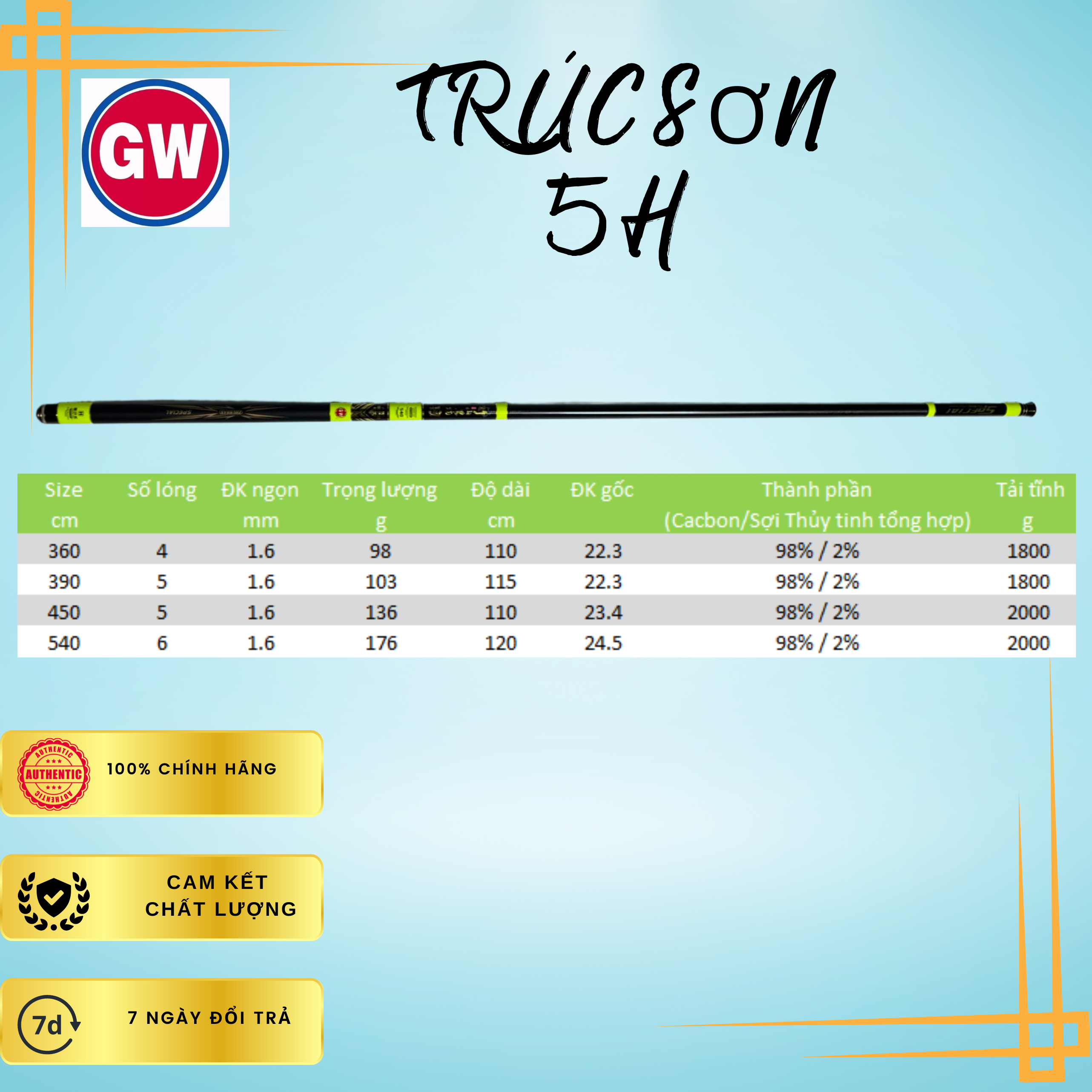 Thông tin sản phẩm : Thuộc thế hệ Trúc Sơn đen với các độ cứng khác nhau 5H,6H,8H.Chất liệu chính là Cacbon nên siêu nhẹ. Đầu lóng được thiết kế rãnh abs để chống nổ và kẹt lóng.Thân lóng được cấu tạo bởi các lớp vải cacbon xếp chồng lên nhau giúp Trúc sơn 5H có độ dẻo dai cao, bền bỉ . Đầu ngọn cần được kết nối một lớp keo rất chắc chắn .